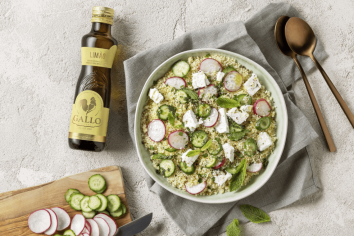 Coloque o queijo feta esfarelado sobre cada fatia de beringela, e regue com a mistura de Azeite Novo e ervas.