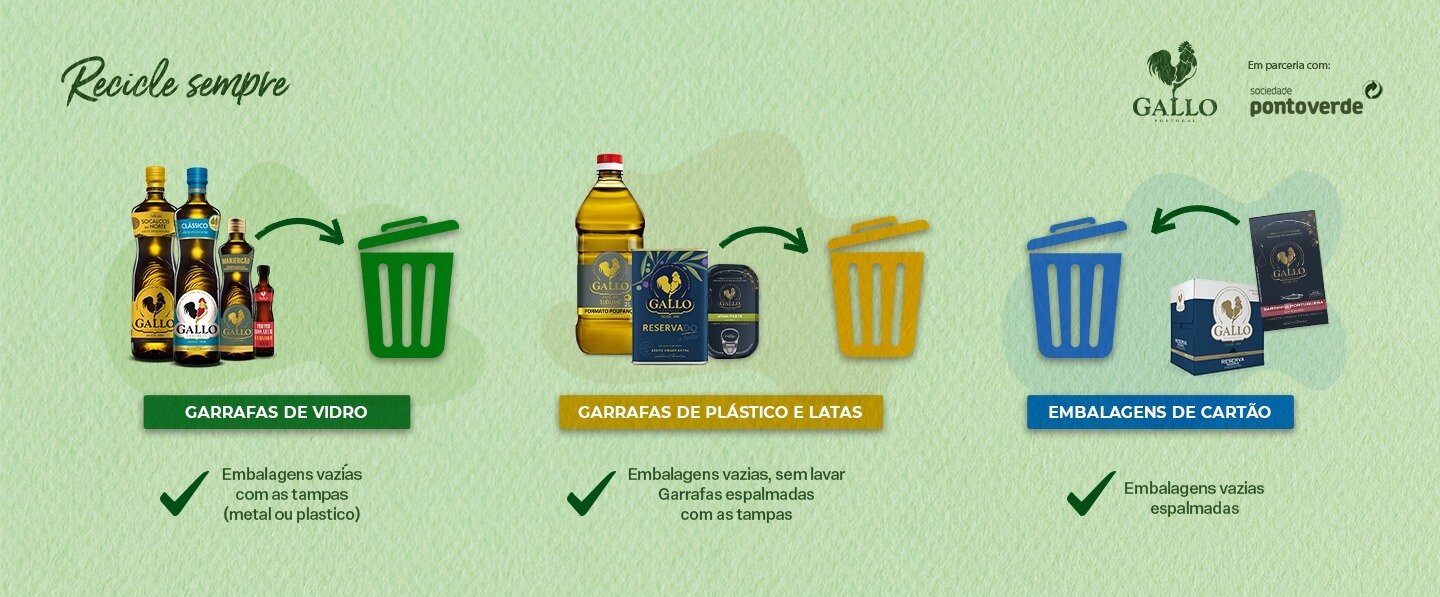 As garrafas monodose de Azeite Virgem Extra, Vinagre de Vinho Branco e Vinagrete Gallo, assim que estiverem vazias e por serem de plástico, devem ser colocadas no ecoponto amarelo. Não deite as embalagens no lixo comum, pois assim elas não serão recicladas e não está a contribuir para termos um bom planeta.