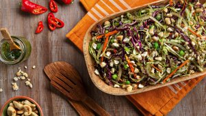 A continuación, preparar la salsa. Mezclar en un bol 4 cucharadas de Aceite de Oliva Reserva Gallo con la salsa de soja, los copos de guindilla, el Vinagre Gallo, sal y pimienta.