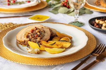 Préchauffez le four à 180ºC. Coupez la poitrine de dinde en deux et coupez les côtés de manière à ce que les morceaux deviennent rectangulaires.