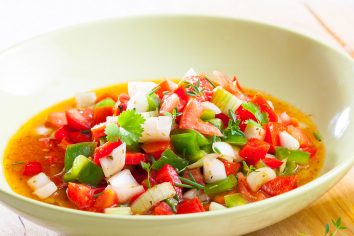 Junte a quinoa, as ervilhas escaldadas, a malagueta finamente picada e as folhas de coentros e de salsa.