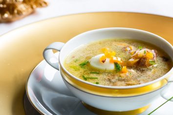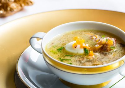 Podawaj, kładąc zieloną zupę na głębokim talerzu, a następnie białą zupę.