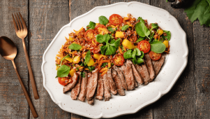 Coloque por cima o tomate, os pimentos e a chalota picada. Tempere com mais um pouco de sal.