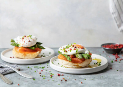 Para o ovo escalfado, aqueça num tacho água com o vinagre. Quando estiver a formar borbulhas abra um ovo para dentro da água e vá juntando a clara de forma a escalfar o ovo. Repita o processo com os restantes ovos.