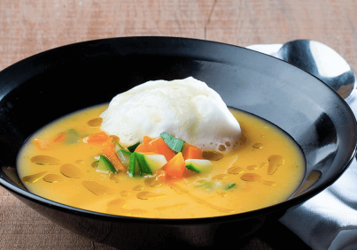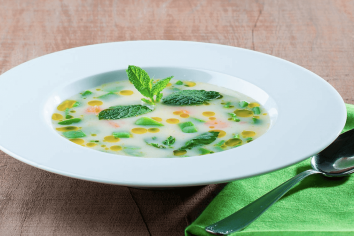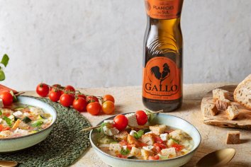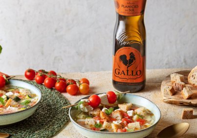 Sirva em taças decorado com pepino aos cubos, as ervas, o feta e termine com um pouco de pimenta e um fio de Azeite Gallo Aromatizado com Alho e Pimenta.