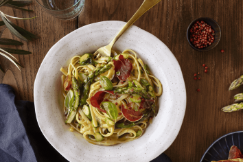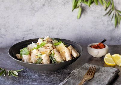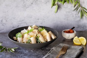 Adicione o tomate, envolva e junte a massa escorrida, em seguida a rúcula, a raspa de limão e finalize com o piri-piri.