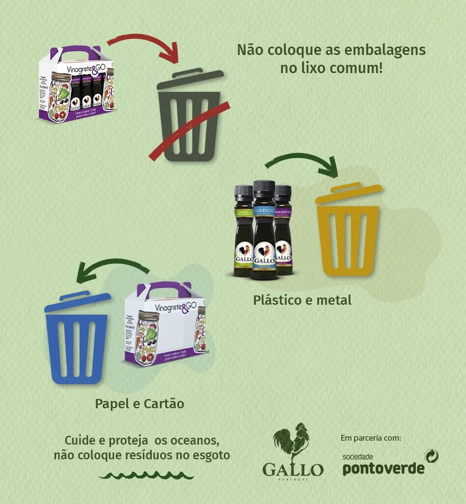 As garrafas monodose de Azeite Virgem Extra, Vinagre de Vinho Branco e Vinagrete Gallo, assim que estiverem vazias e por serem de plástico, devem ser colocadas no ecoponto amarelo. Não deite as embalagens no lixo comum, pois assim elas não serão recicladas e não está a contribuir para termos um bom planeta.