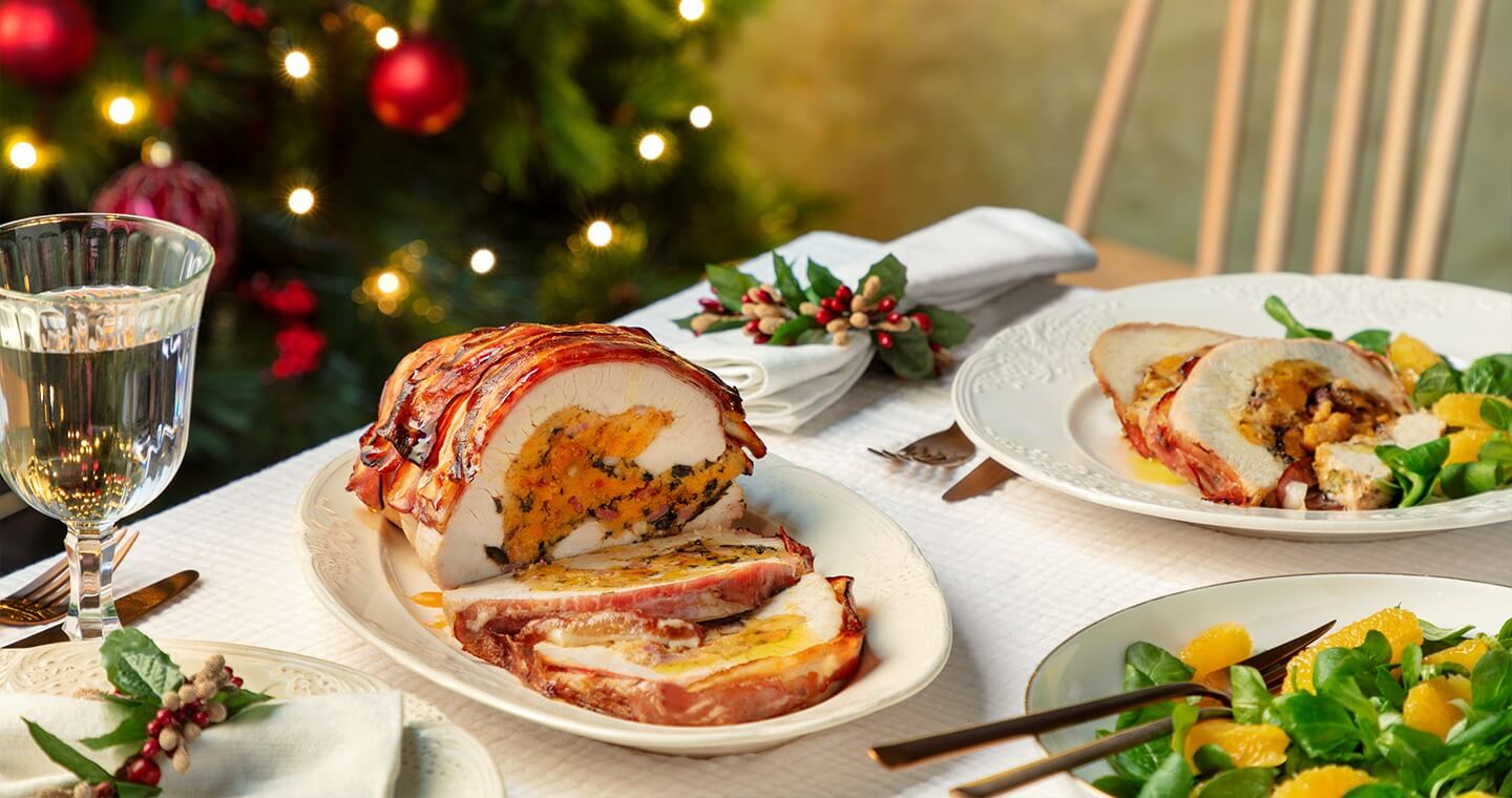 Prato de Carne: Peito de peru com laranja, recheado com broa, ervas e bacon