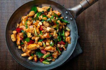 Add the sugar to the frying pan, stir and simmer for another 3 minutes over a low heat. Season with pepper and set aside.