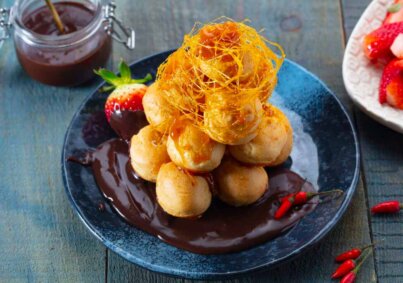 Put the honey, the orange peel and juice, olive oil and the cinnamon sticks in a heated pan. Let them slowly boil until you get a syrup.