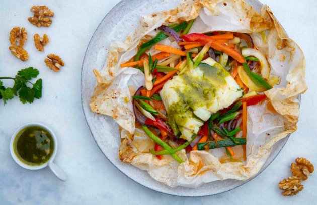 Prato de Peixe: Papelote de bacalhau fresco com molho de coentros