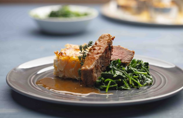 Prato de Carne: Lombo de borrego com batata gratinada e espinafres
